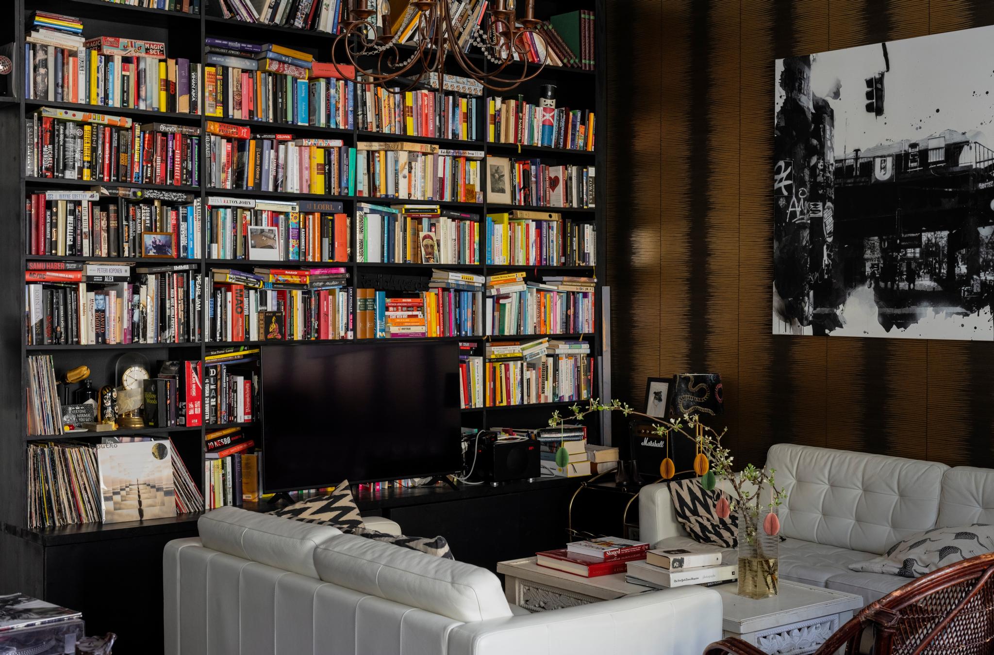 Punaisen keittiön kulmassa pilkottaa erkkerisyvennys, jossa on isokuvioiset oranssit tapetit. Olohuonetta hallitsevat kattoon asti ulottuvat mustat kirjahyllyt, jotka Anna ja Sami teettivät tutulla puusepällä.