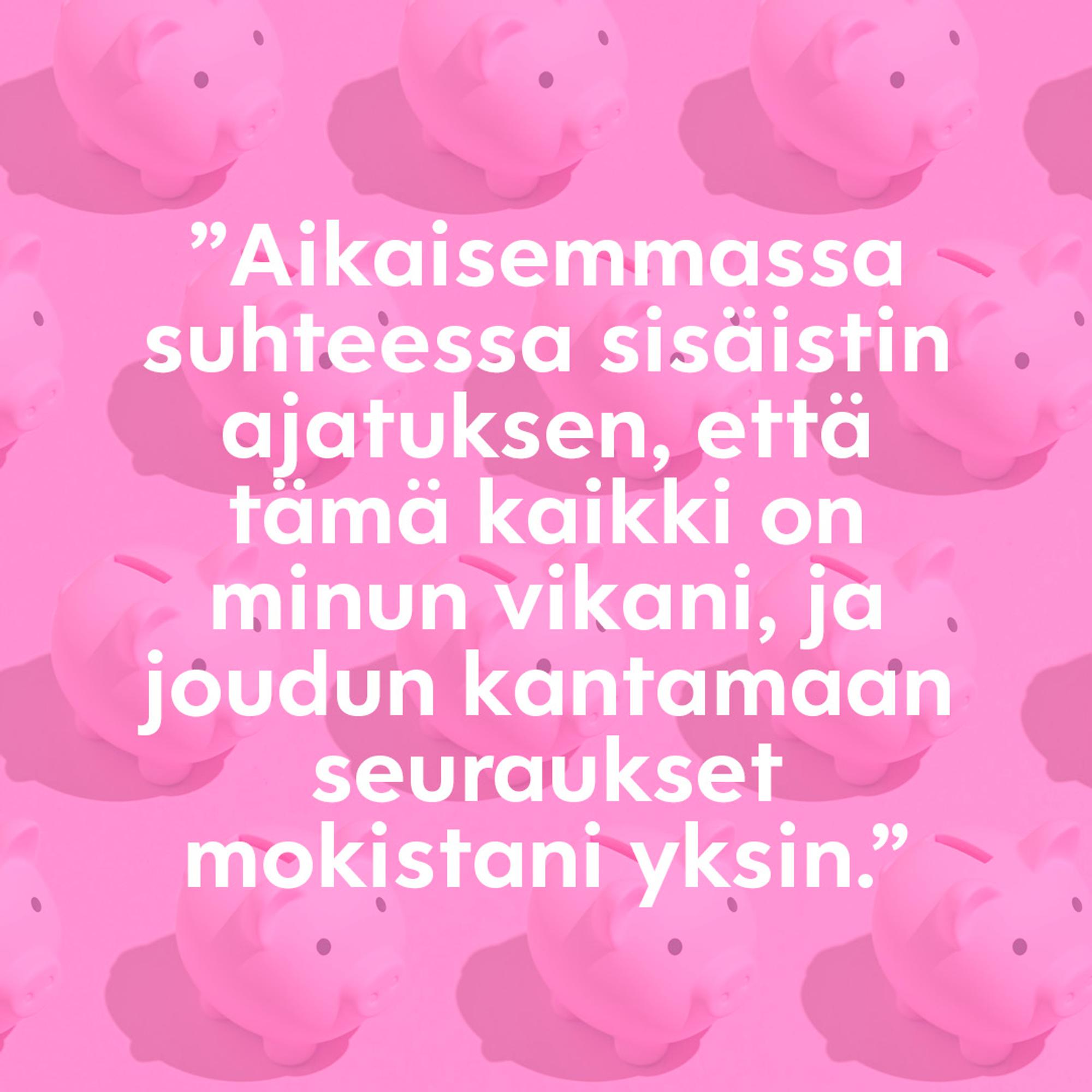 ”Aikaisemmassa suhteessa sisäistin ajatuksen, että tämä kaikki on minun vikani, ja joudun kantamaan seuraukset mokistani yksin. Nykyisessä suhteessa puhumme rahasta suoraan, ja yritämme löytää myös ratkaisuja yhdessä. Suurin muutos omassa ajattelussani on, että pystyn nyt ottamaan paremmin apua, taloudellistakin sellaista, vastaan. Aiemmin ajattelin, etten ansaitse sitä.”