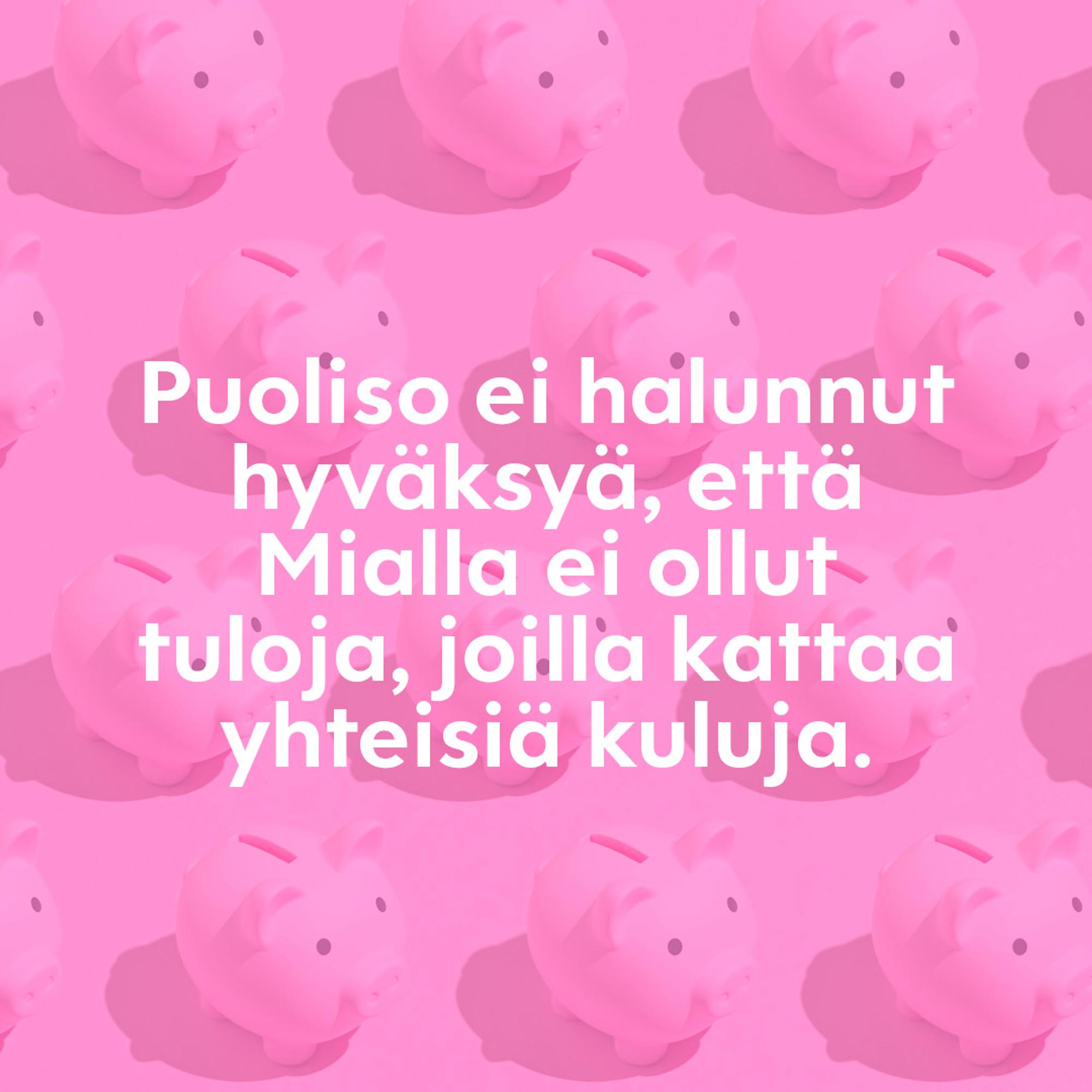 ”Avioliitossamme oli mieheni määrittelemä käsitys, että kaikki kulut jaetaan puoliksi. Hän saattoi tulla laskupinon kanssa luokseni ja sanoa, että maksoin juuri 500 eurolla laskuja, maksa sinä nämä", Mia muistelee.