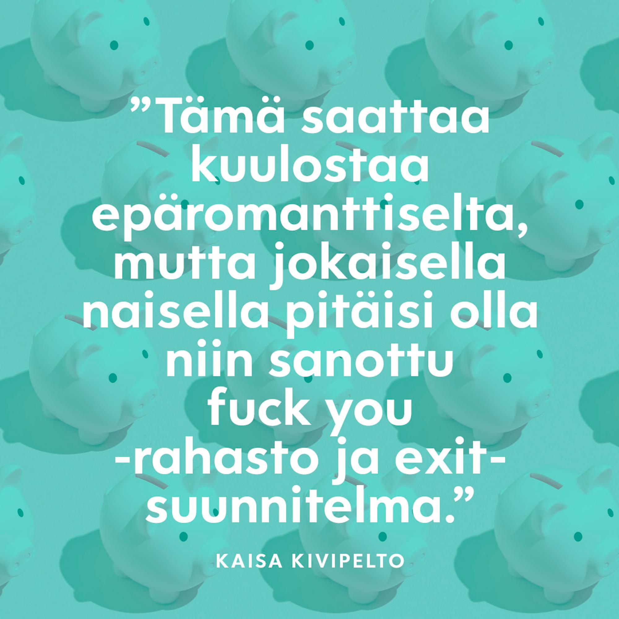 ”Tämä saattaa kuulostaa epäromanttiselta, mutta jokaisella naisella pitäisi olla niin sanottu fuck you -rahasto ja exit-suunnitelma. Eli jotakin, jonka avulla päästä eteenpäin jos parisuhde kariutuu. Itse asiassa se on romanttinen ajatus: puolison kanssa ei tarvitse olla taloudellisen pakon vuoksi vaan siksi, että itse niin haluaa.”