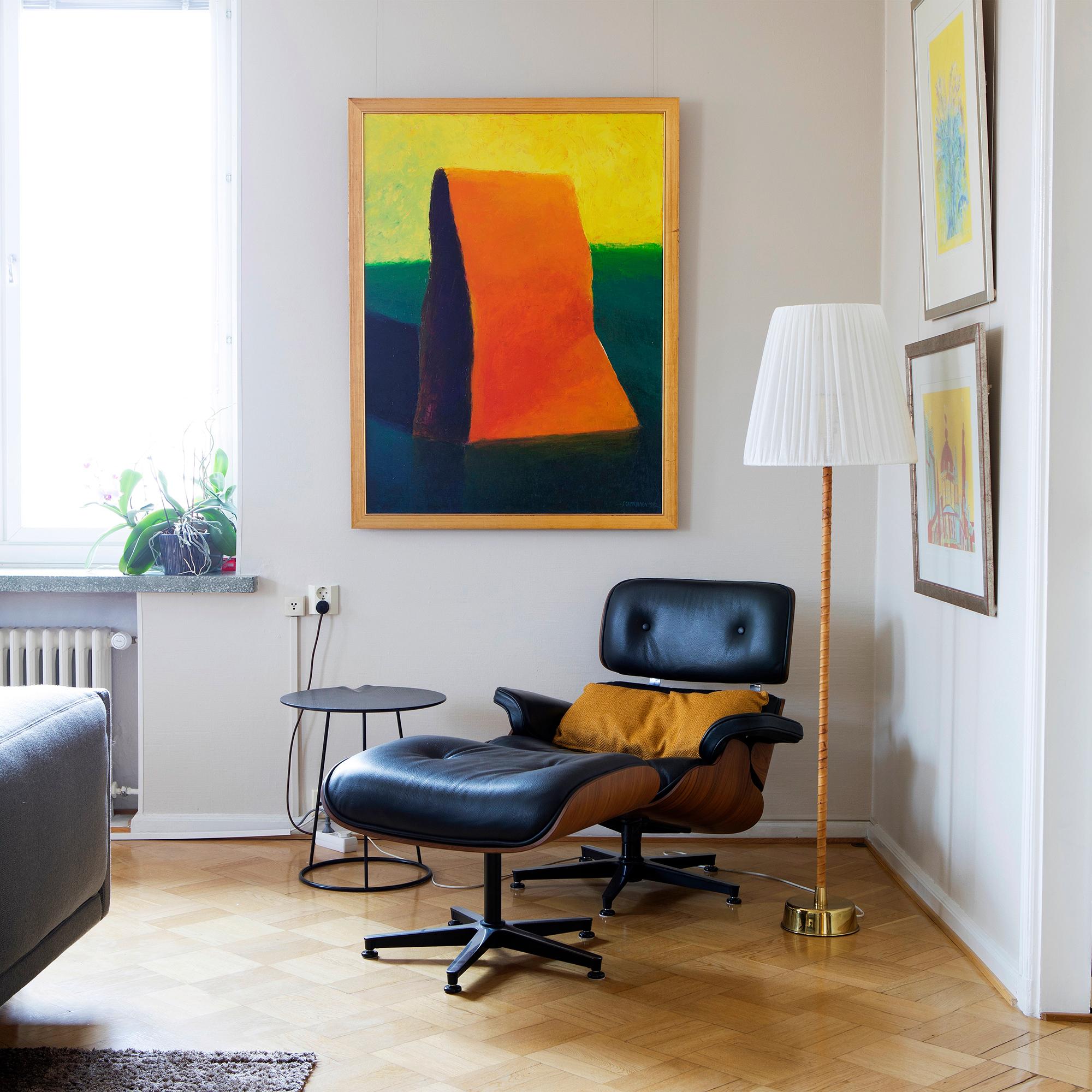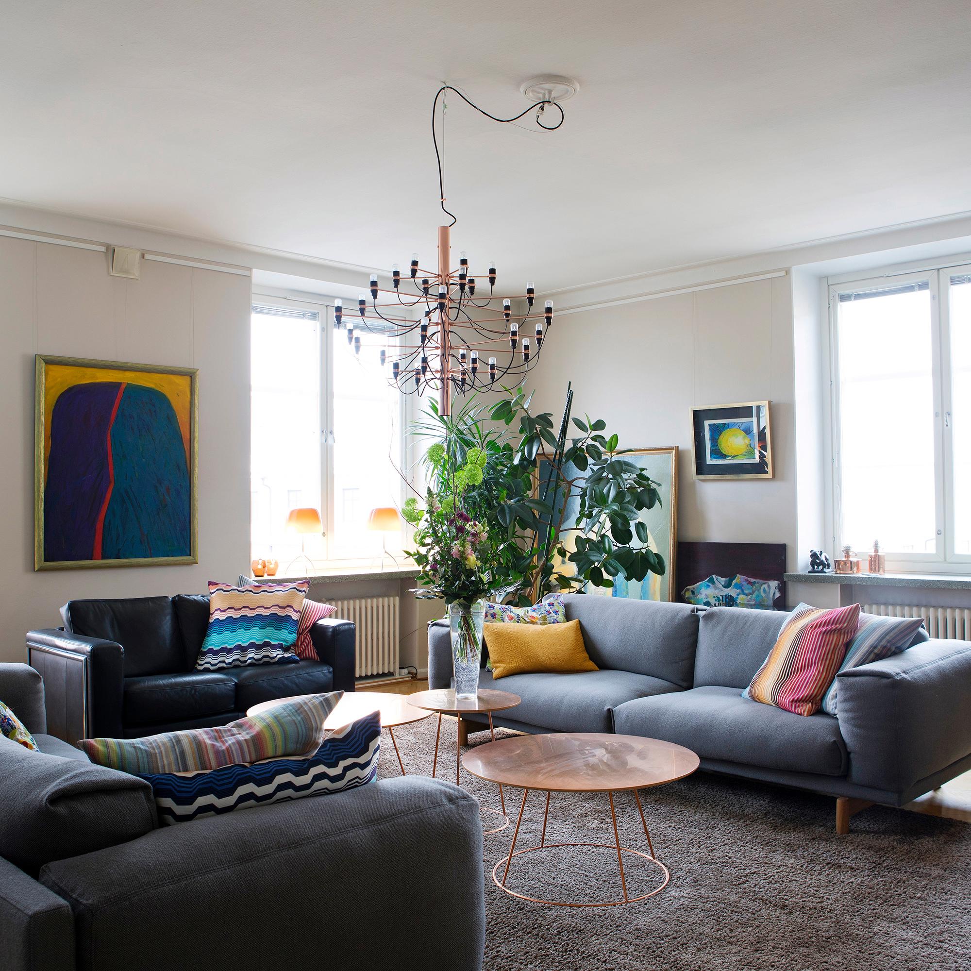 Apuna kodin uudelleenjärjestelyissä on ollut turkulainen sisustussuunnittelija Tomi Kouvola. Olohuoneen värimaailman sisustuksen ammattilainen otti maalauksista, jotka somistavat huoneen seiniä.