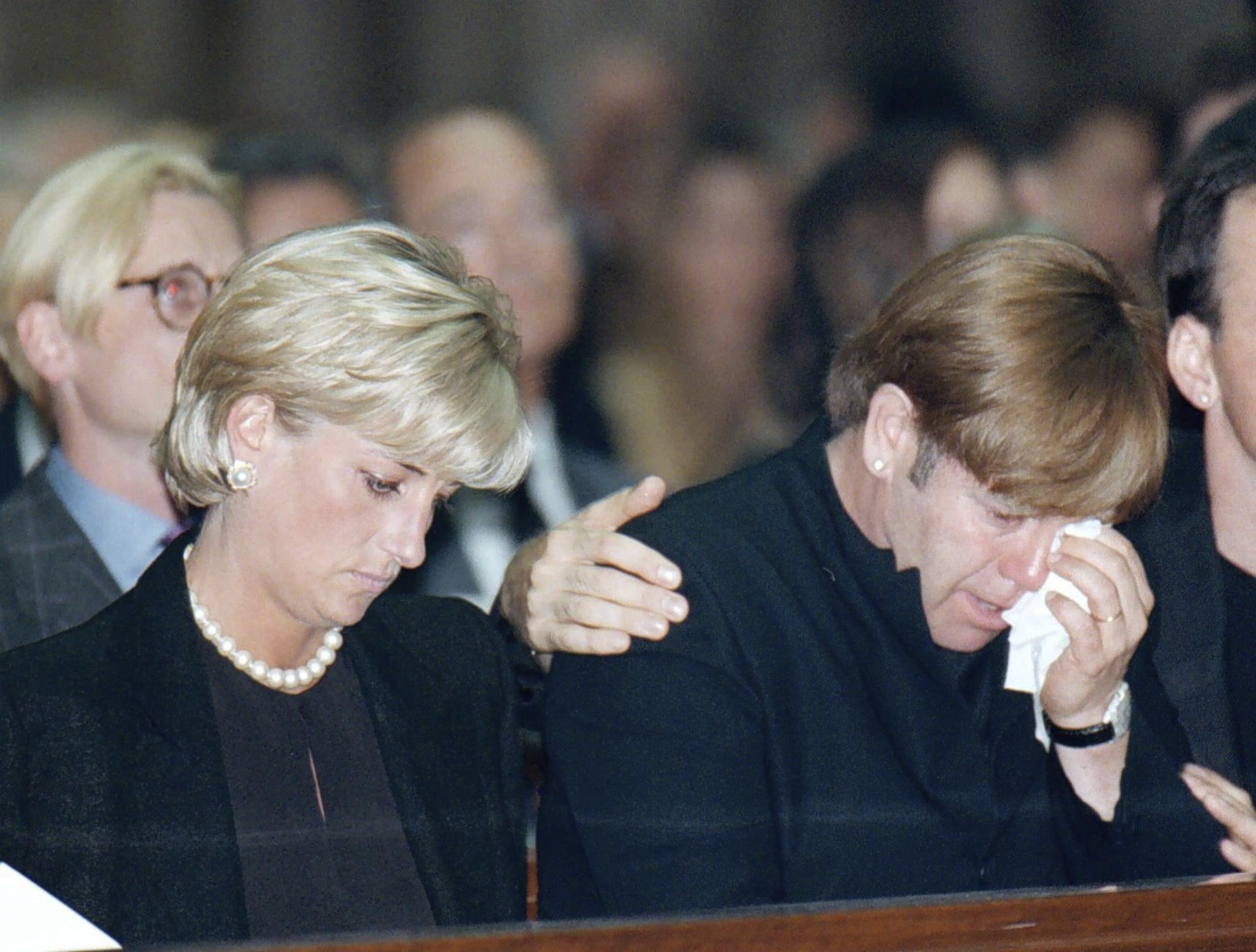 Läheiset ystävykset prinsessa Diana ja Elton ystävänsä Gianni Versacen muistojumalanpalveluksessa heinäkuussa 1997. Versace oli murhattu viikkoa aiemmin.