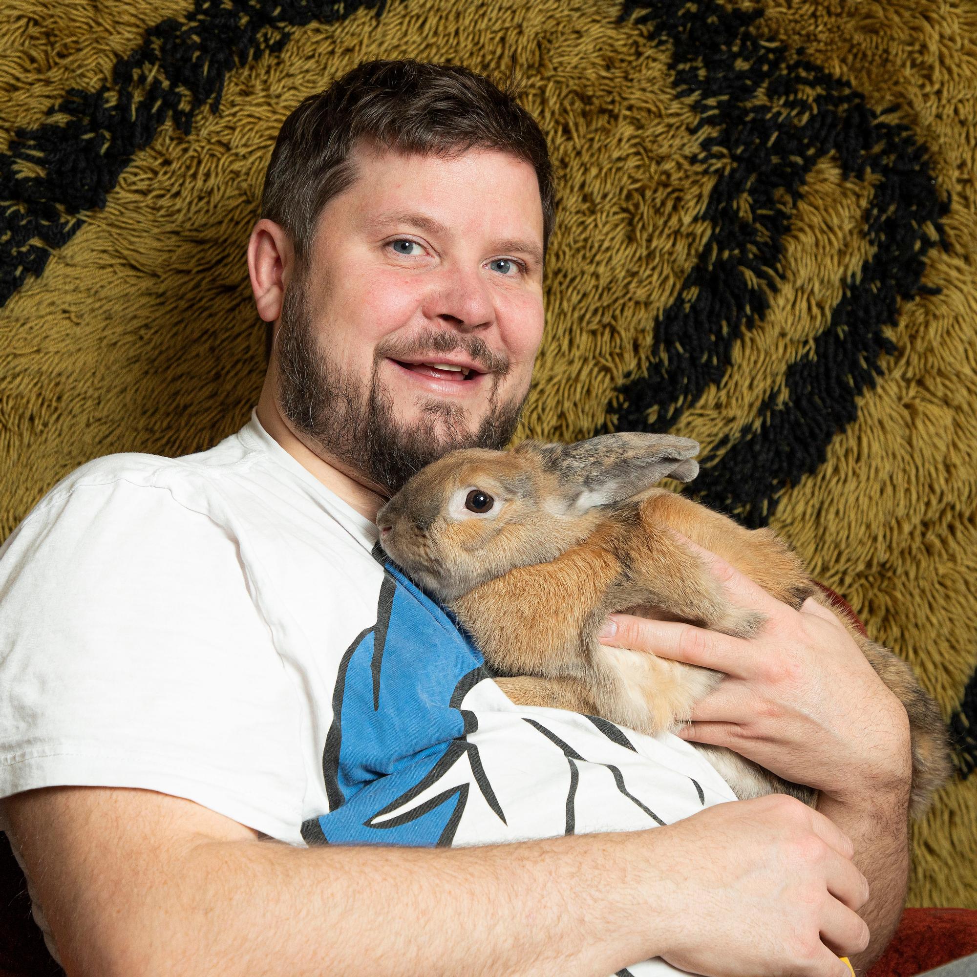 Näyttelijä, koomikko Janne Kataja, 40, rentoutuu perheen kolmen kanin seurassa.