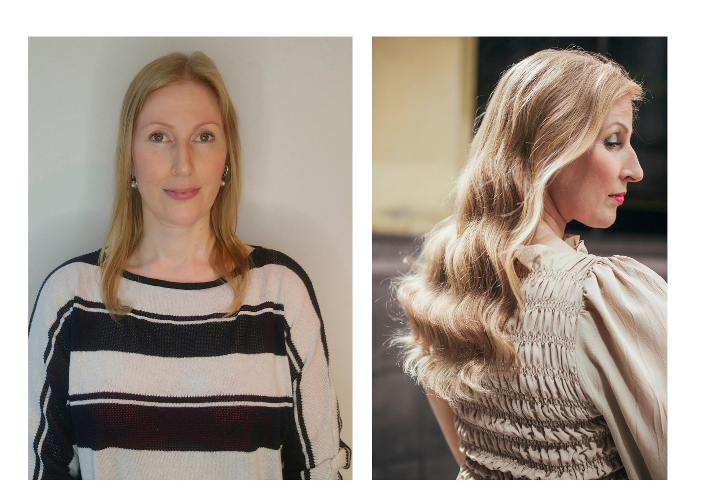 Hiukset Roosa Soulanto/Rapunzel of Sweden. Kiharat: 40-senttinen Clip-on Original 7.3 Cendre Ash -aitohiuspidennys sävytettiin Paulan hiusten väriseksi Color Mask Peach -sävymaskilla. Hoitoaine Hydrate & Care Conditioner. Pidennykset föönattiin kuiviksi, kiinnitettiin ja leikattiin muotoon. Laineet tehtiin keraamisella World Pro -kiharrusraudalla. Clip-on Original -klipsipidennyksiä saa 65 sävyssä, pituudet 30–70 cm. Hinnat 108–128 e/7 kpl. Poninhäntä: 40-senttinen Clip-in Ponytail 7.3 Cendre Ash -aitohiusponinhäntäpidennys sävytettiin Paulan hiusten väriin. Poninhäntäpidennyksiä saa 42 sävyssä, pituudet 30–60 cm. Hinnat 72–212 e.