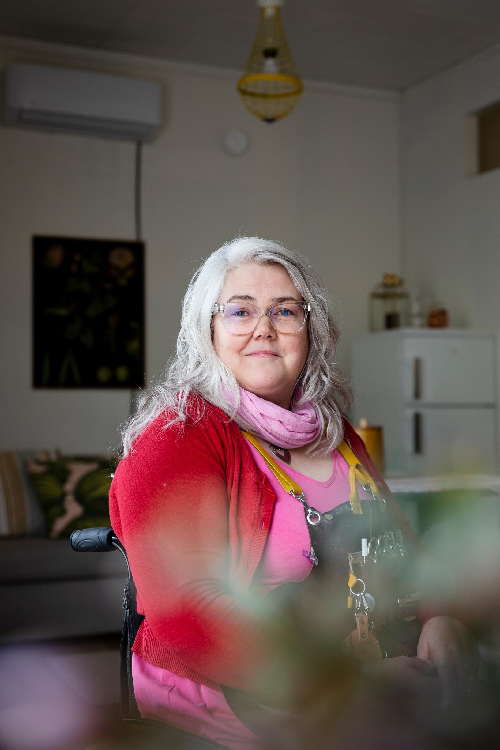 ”Minulle myönnettiin jo pari vuotta sitten oikeus henkilökohtaiseen avustajaan. Palkkasin hänet vuosi sitten aloittaessani tämän yrityksen. Hän tuo minut liikkeeseen, ottaa pyörätuolin autosta ja hakee postin. Lisäksi hän siivoaa kotonani. Suihkussa onnistun vielä käymään yksin.”