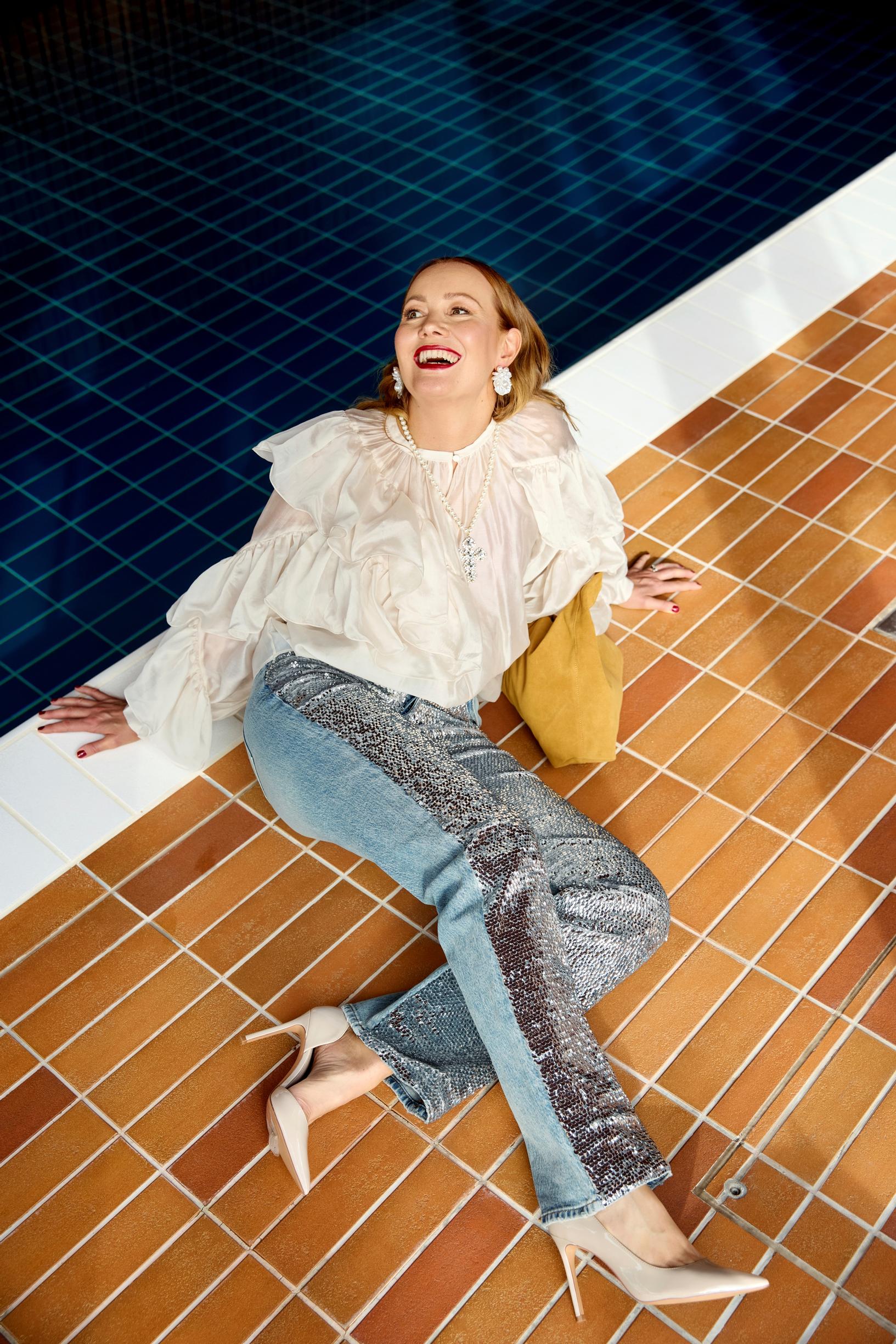 Kevään juhlissa kietoudutaan röyhelöihin, säihkytään paljeteissa ja ylennetään t-paita juhlavaatteeksi. Marja Hintikka näyttää mallia.