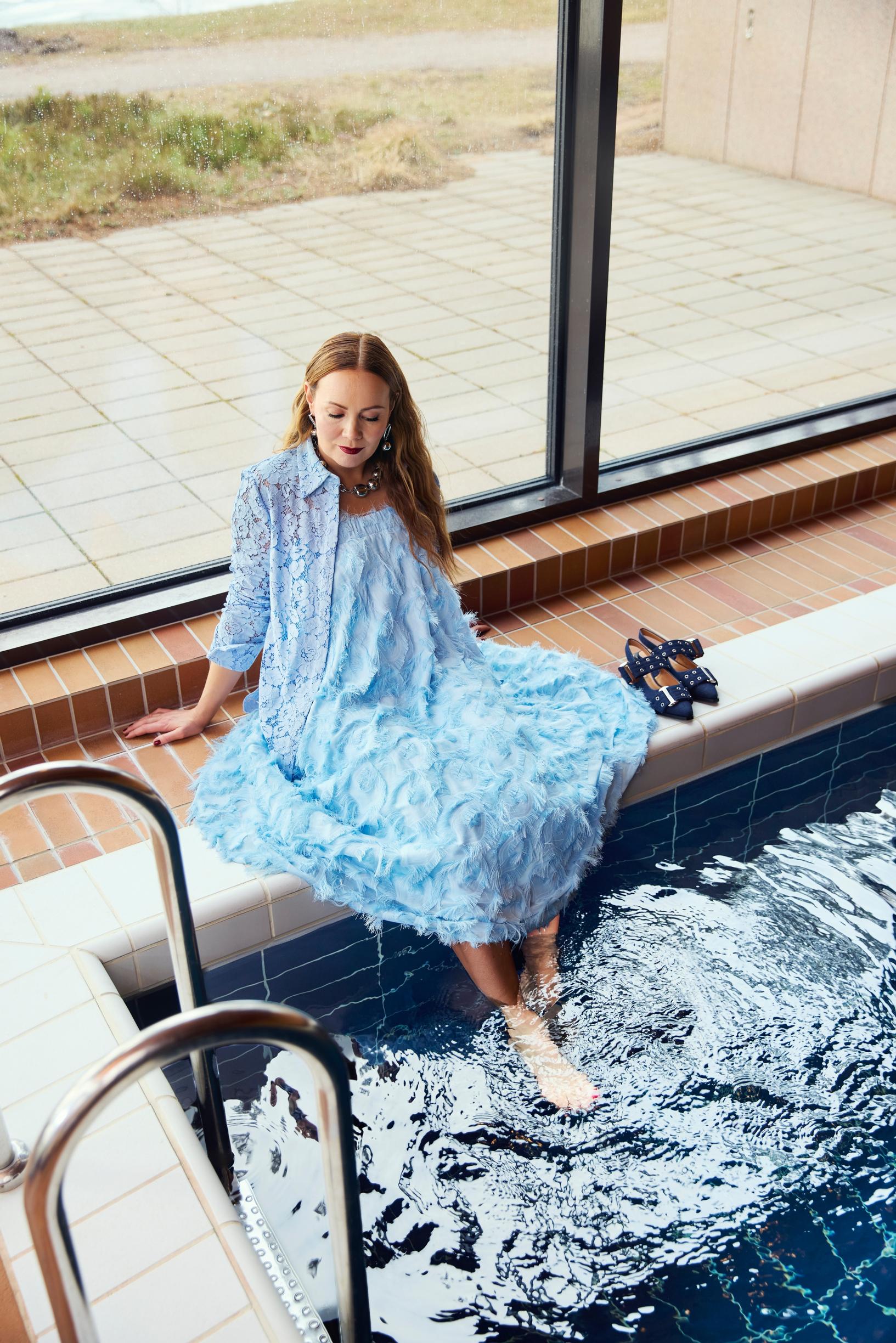 Taivaansininen on valloittava valinta. Yhden värin taktiikalla voi helposti leikitellä eri materiaaleilla. Kuvan mekko on oikeasti maksihame, joka on puettu mekoksi.