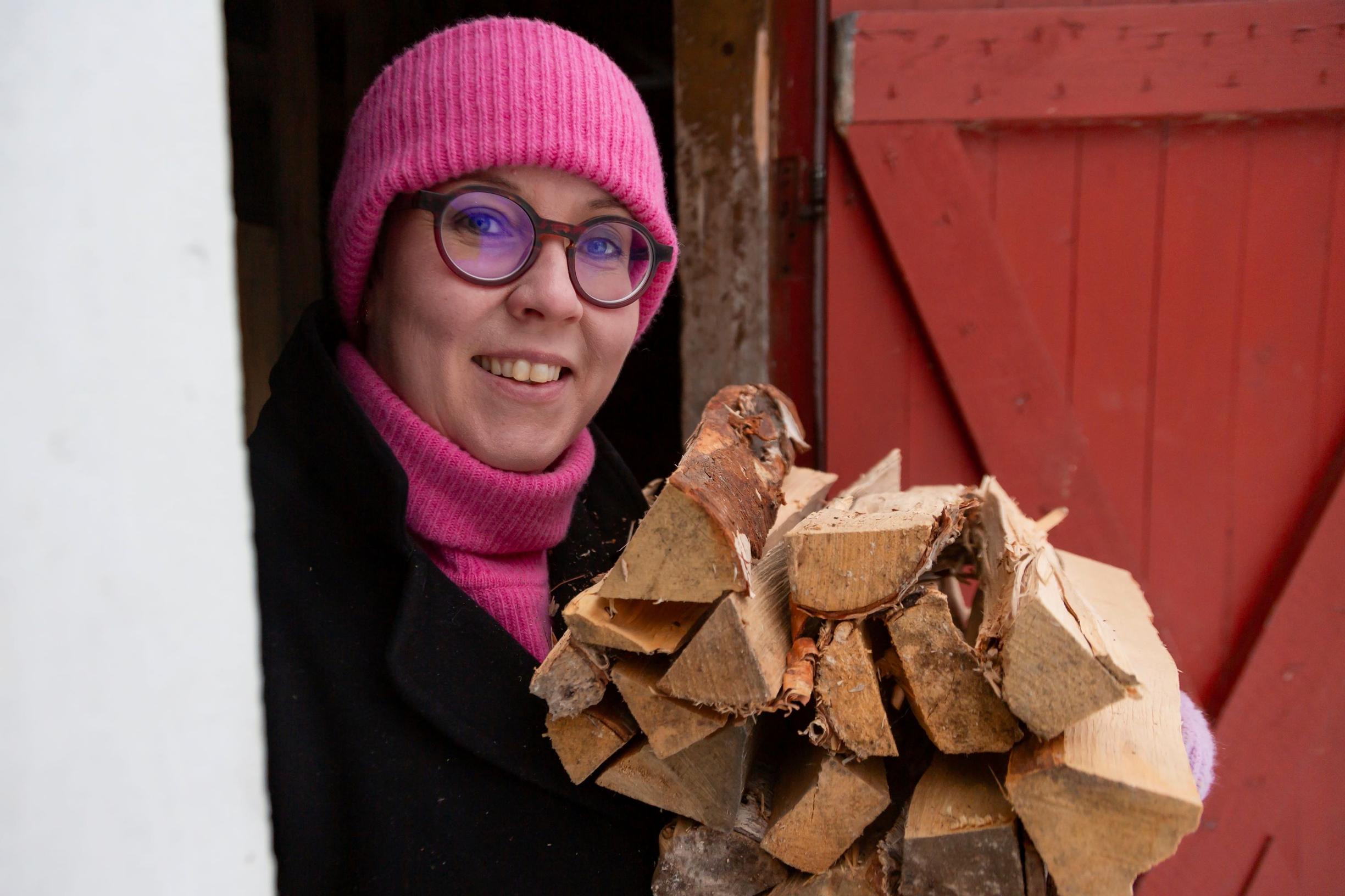 Kansanedustaja Merja Kyllönen, 47, julkaisi syksyllä Facebookissa kuvaparin. Oikeanpuoleisessa kuvassa autoon on istuutumassa Suomussalmella Merja, jolla on yllään tuulipuku ja keltaiset kumisaappaat. Sylissä nököttää halkokassi.
