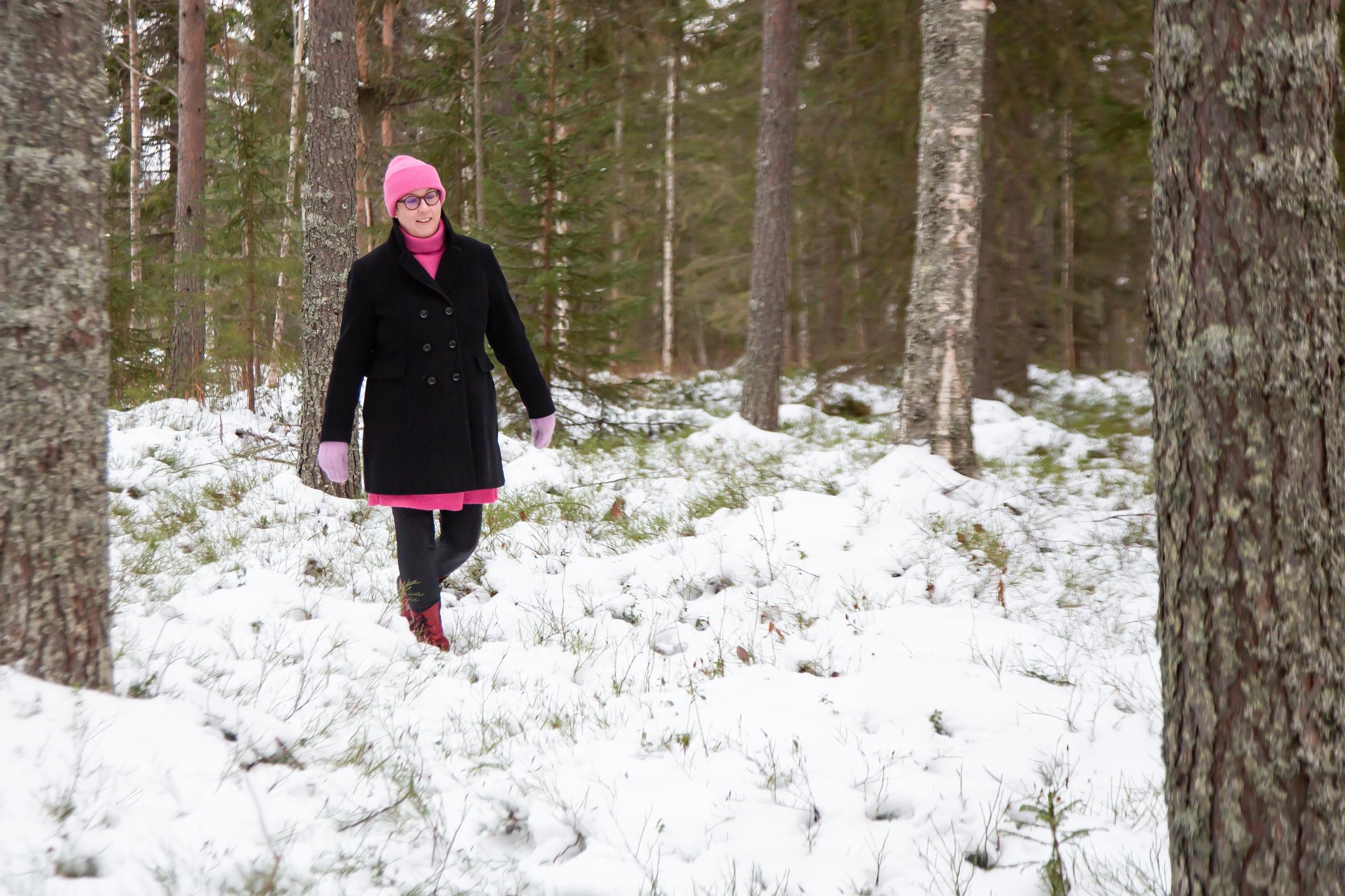 Tykkään hengittää metsää ja nojailla puuhun. Kuulostelen metsän sydänääniä ja kehoni vastauksia niihin.