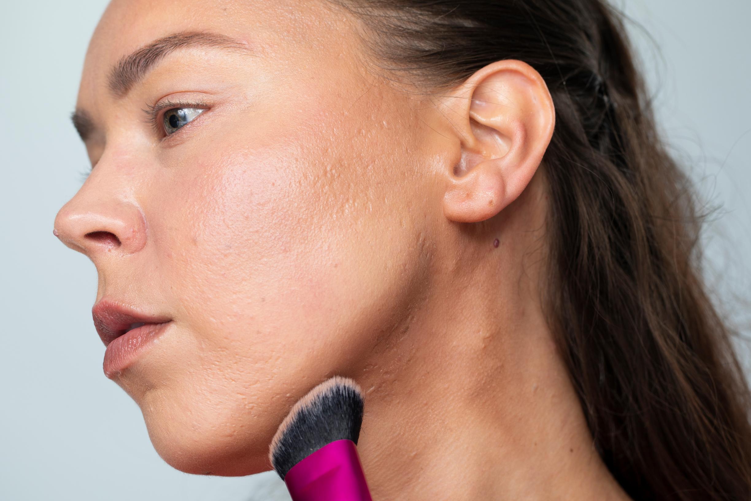 1. Levitä voidemaista varjostusväriä paksulla viistokärkisellä korostussiveltimellä ohimoille aivan hiusrajasta asti. Siirry ohimolta alaspäin. Vedä väriä korvalehden yläreunan kohdalta kohti suupieltä, myötäile koko ajan siveltimellä poskiluuta. Varjostusväri kulkee poskiluun notkon kohdalla, poskiluun alaosassa. Kun sijoitat värin näin, tulos on luonnollisempi.