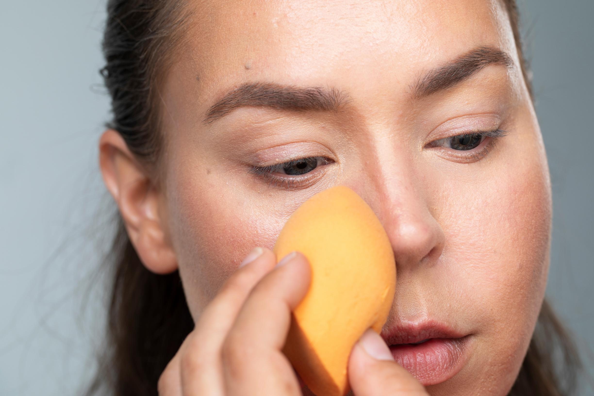 4. Häivytä ja pehmennä lopuksi varjostusten rajat hanan alla kostutetulla meikkisienellä. Riittää, että painelet sienellä läpi alueet, joille olet levittänyt varjostusväriä. Varo vetävää liikettä, ettei väri leviä.