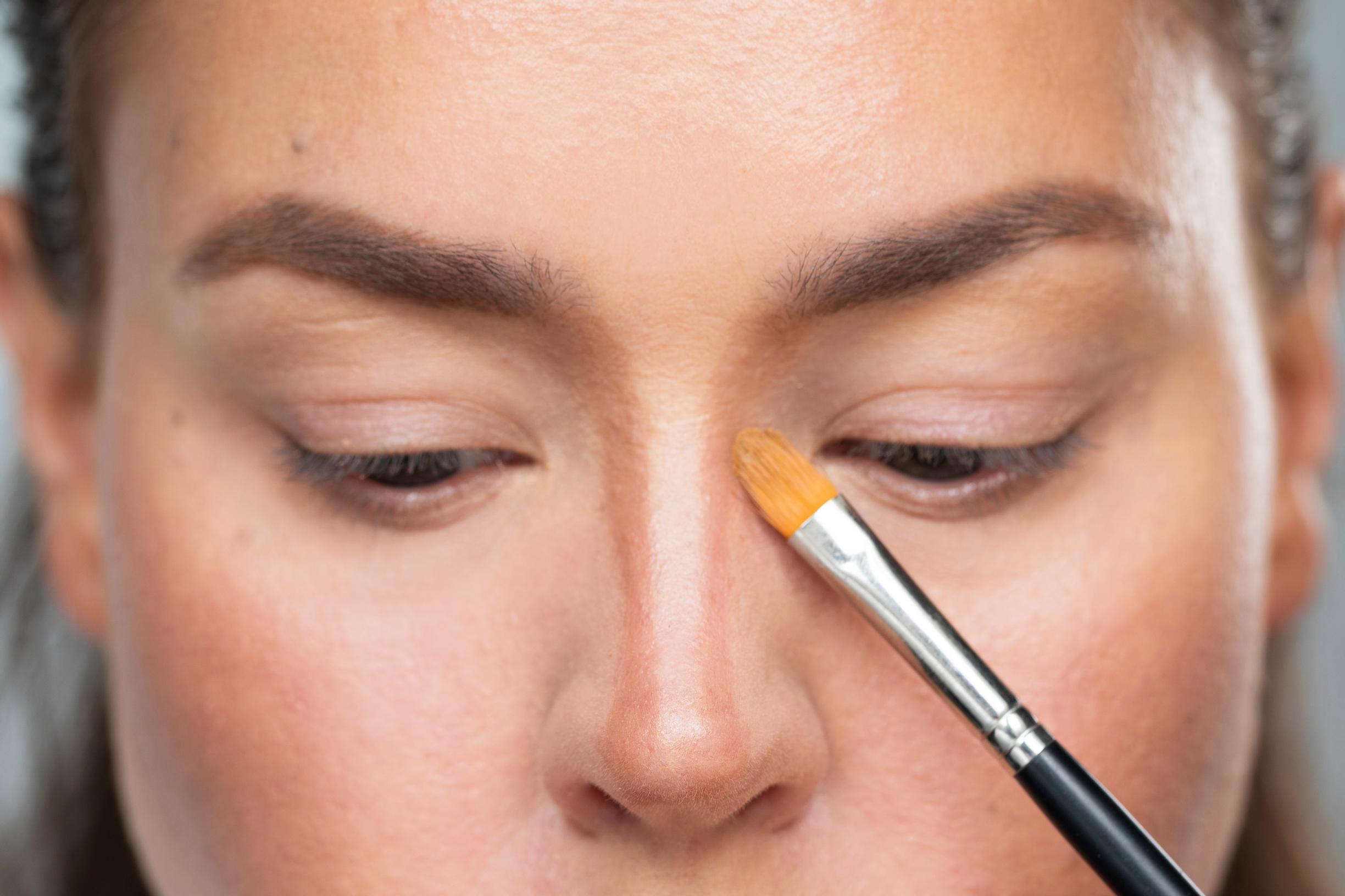 3. Kun haluat kaventaa nenääsi, vaihda kapeaan siveltimeen. Esimerkiksi luomivärisivellin käy hyvin. Maalaa voidemaisella varjostusvärillä ”koeputkimainen” alue nenän päälle, kuten kuvassa. Keskelle jää kapea, vaalea alue. Ulota väri kulmakarvojen alkuun saakka. Muista, että nenän sivuille levitetty varjostusväri leventää. Levitä väri siis kapeasti nenän päälle, jos haluat huijata nenäsi kapeammaksi.
