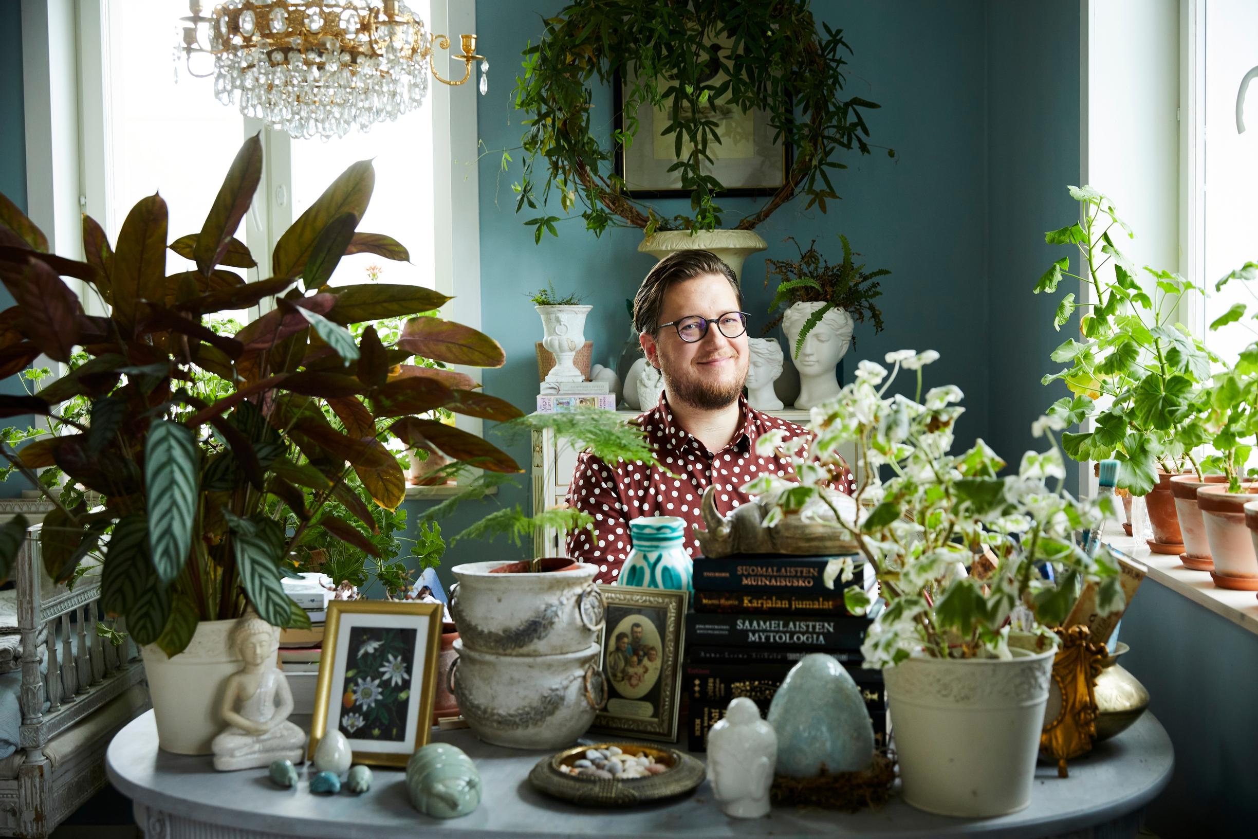 FISKARSIN-TALON SALI on sadunomainen: täällä kasvit, kirpputoreilta ostetut vanhat huonekalut, taljat, valokuvat ja Tonin flyygeli ovat löytäneet oman paikkansa. Tätä taloa ei Ilarin vaimon, hypnoterapeutti ja laulaja Serafiina Edelmannin, 45, mukaan koskaan konmariteta.