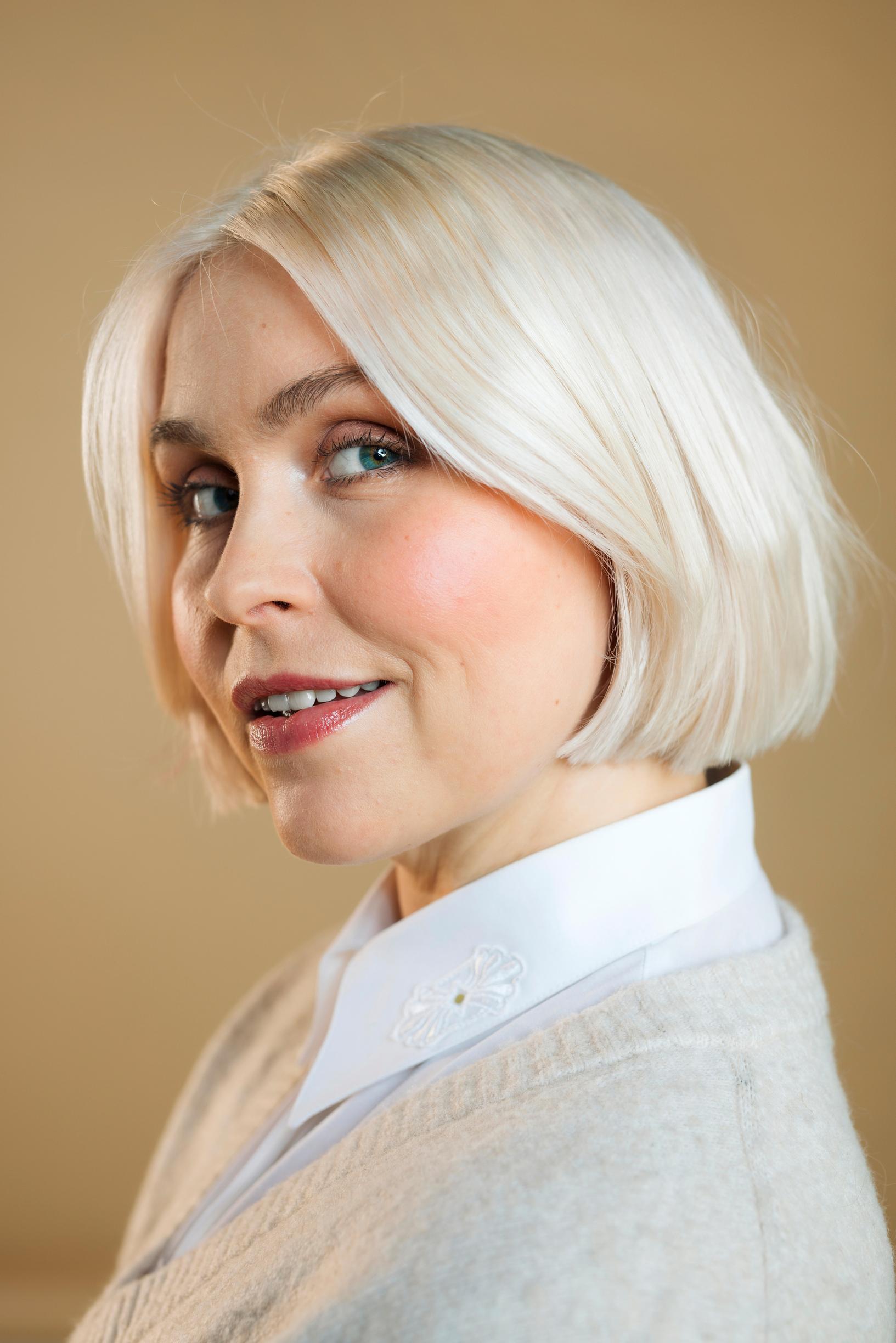 Kustannuspäällikkö Essi Hellénin supertaito on kasvattaa lyhyt polkka hetkessä pitkäksi leijonanharjaksi. Väri pysyy viileän vaaleana supertarkalla rutiinilla.