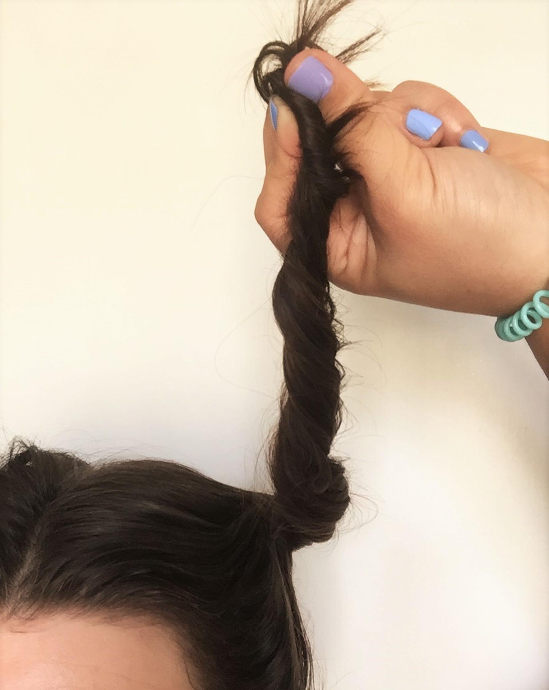 - Jaa hiukset kahteen osaan. Ota toinen osio ja kierrä sitä itsensä ympäri kasvoilta poispäin.