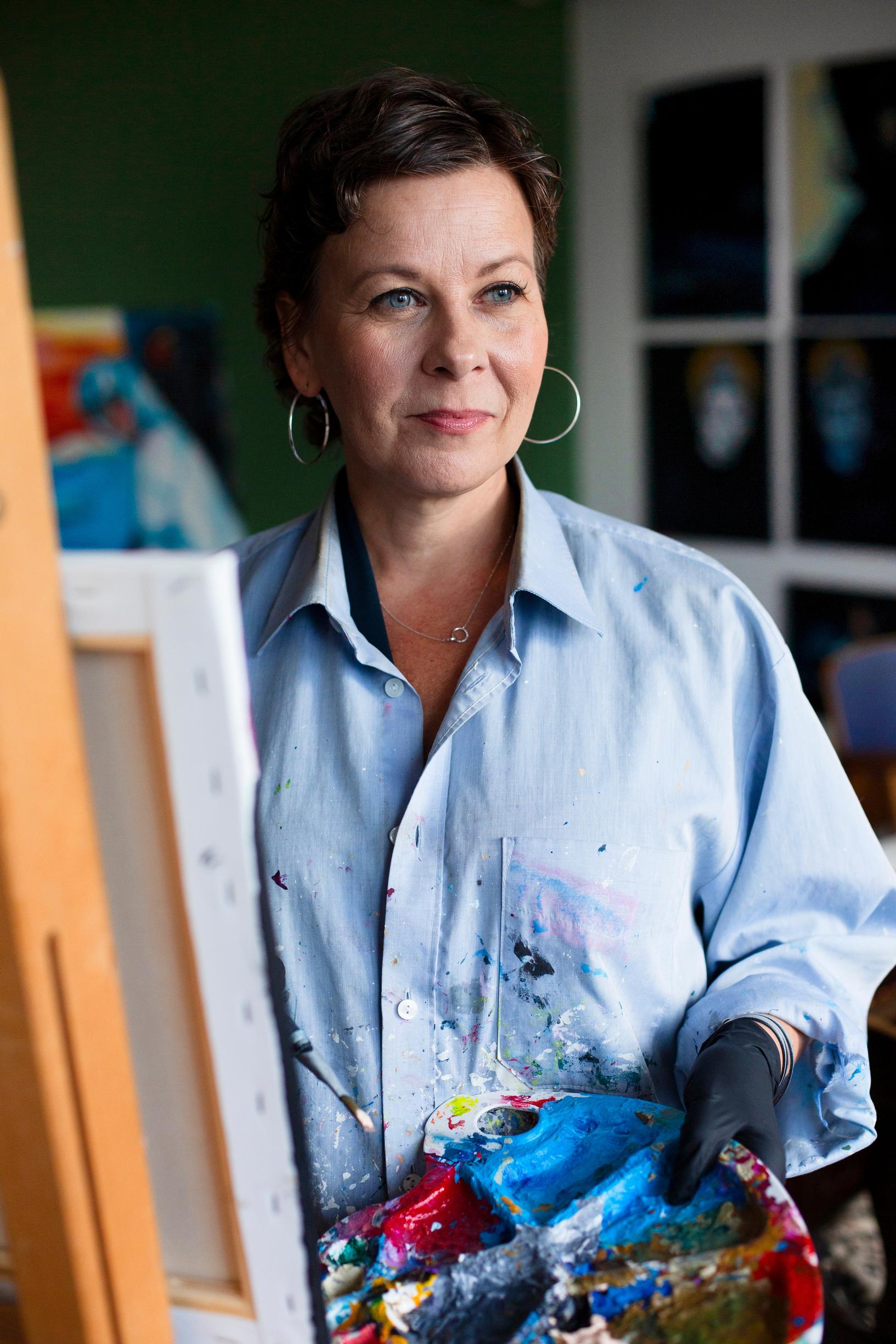 Työhuoneella Helsingin Roihupellossa on levollinen tunnelma. Seiniä koristavat Kristan maalaamat taulut. Lattialla jolkottelee verkkaisasti sekarotuinen Frida-koira, joka on toipumassa aamun eläinlääkärikäynnistä.