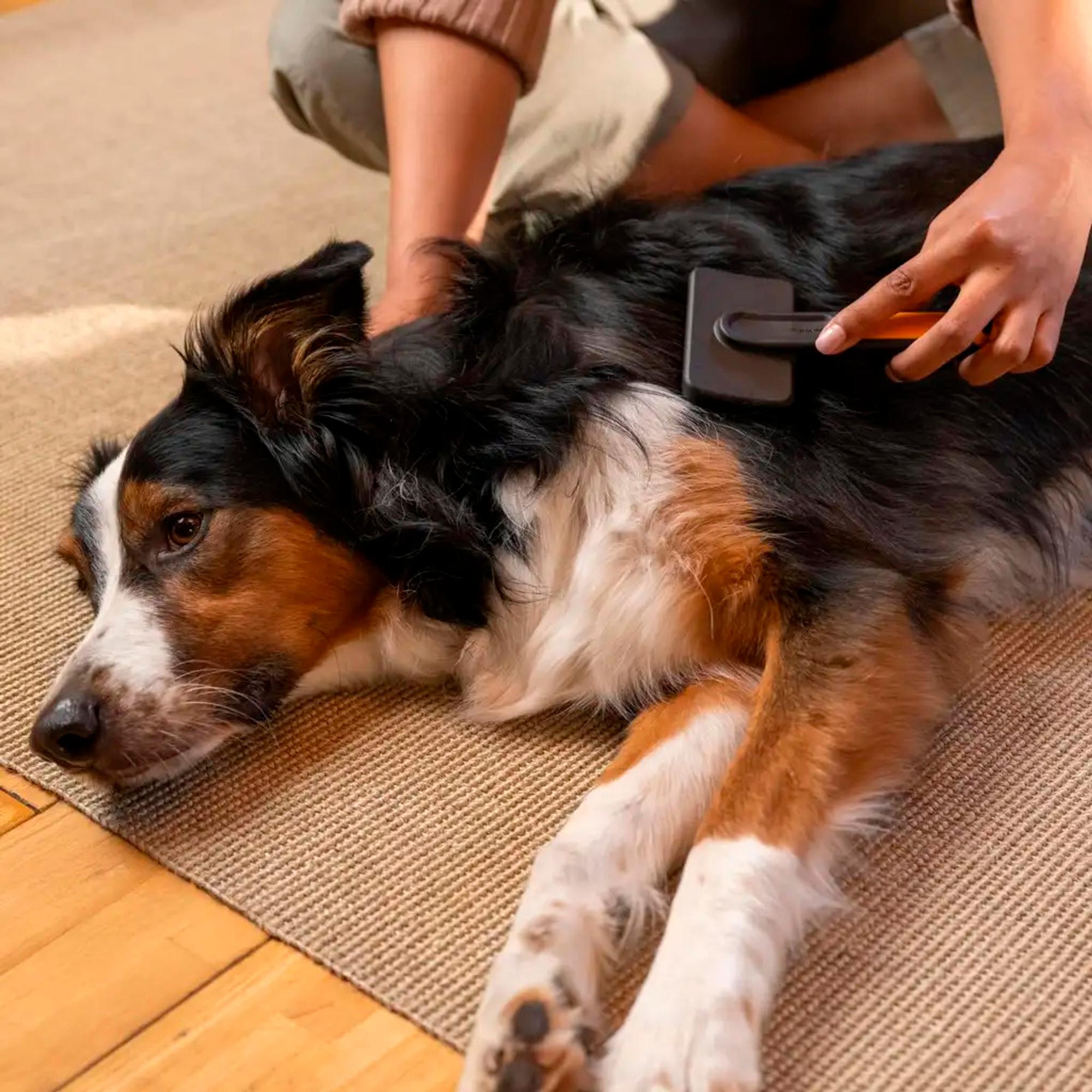 Aattoiltaani vilskettä tuo Teemu-koira, jolle rapsutukset kelpaavat aina. Fiskarsin Hierovan harjan silikoniharjakset hierovat lemmikin ihoa ja irrottavat irtokarvan. Samalla karvaturri rentoutuu ja rauhoittuu. Harjaa voi käyttää myös sampoon hieromiseen. Hännänheilutuksia odotellessa.