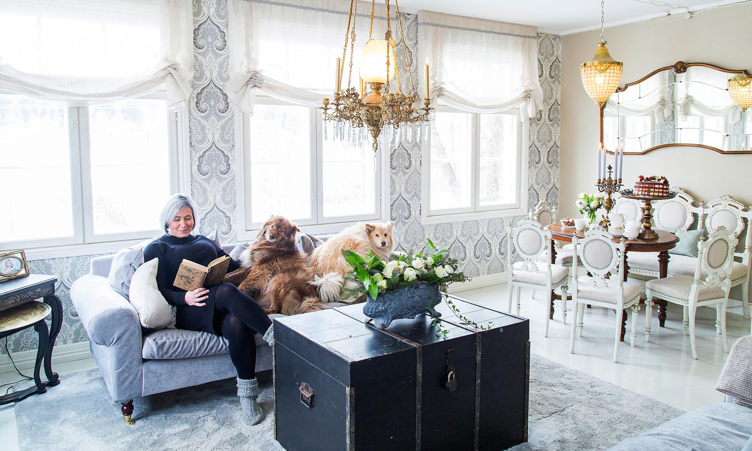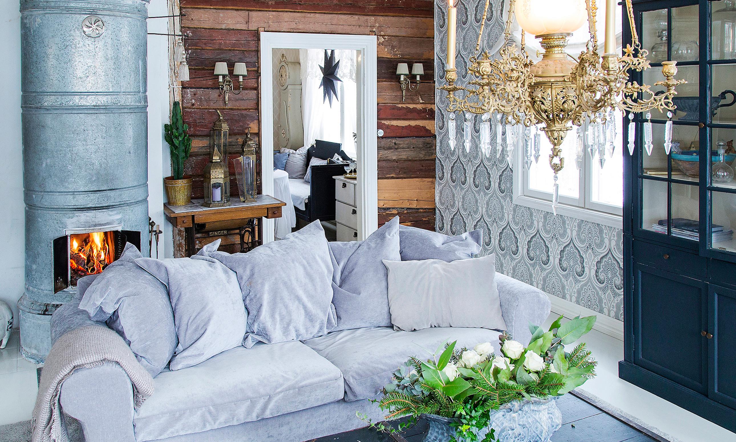 Vanha ja uusi ovat harmoniassa keskenään, värit ja materiaalit kauniisti yhteensopivia: pinkopahvien alta paljastettua hirsiseinää, näyttäviä tapetteja ja kaunista antiikkia. Harsonohuet pellavaverhot antavat lumoavan loppusilauksen kaiken ylle.