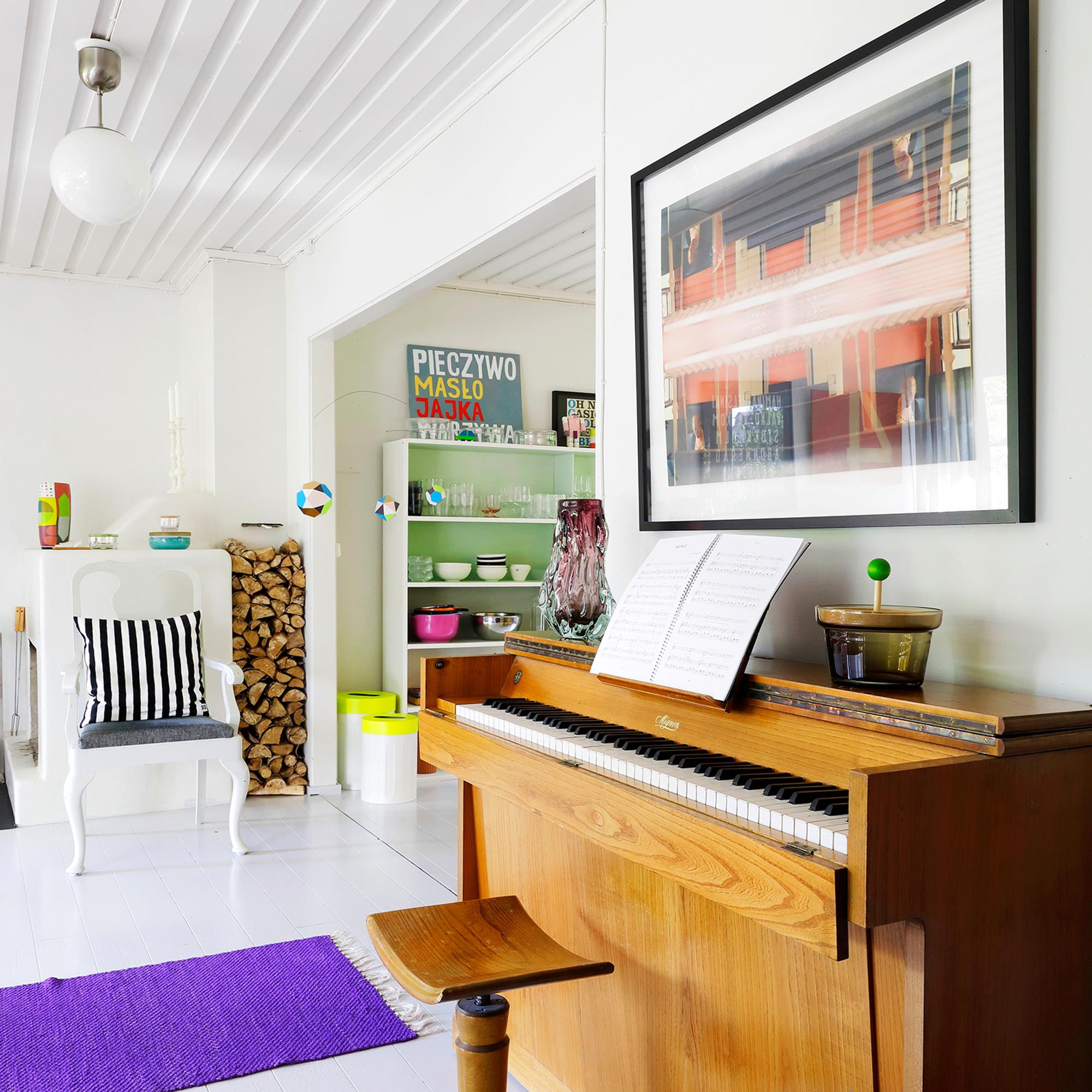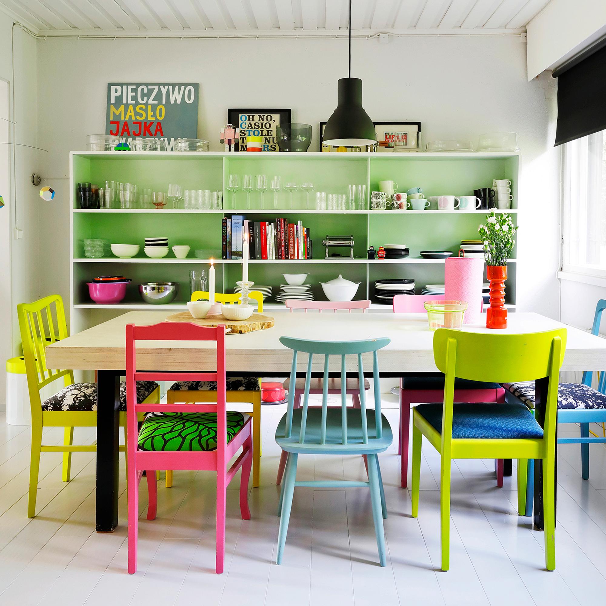 Kirpputoreilta löytyneet vanhat tuolit ja kaapit taiteilija on itse maalannut. Myös tanskalaisen Kvikin valkoinen keittiö heräsi eloon Anun käsissä, kun osa sen paneeleista sai uuden värin.