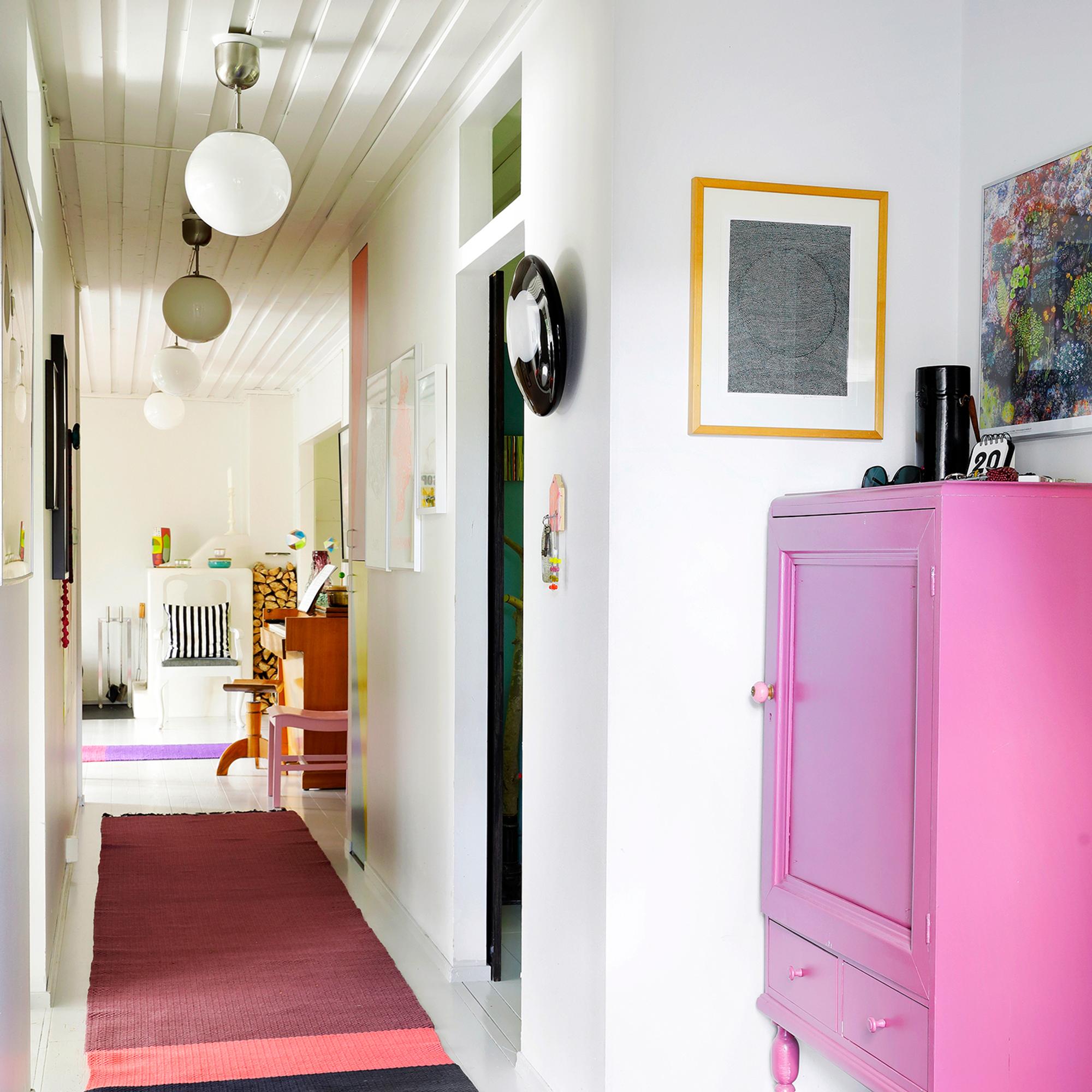 Valoisa koti on ilmeeltään raikas ja hauskasti väritetty. Talon nykyisen omistajan lempiväri, vahva pinkki, hehkuu monessa huoneessa yhdessä pastellisävyjen kanssa.