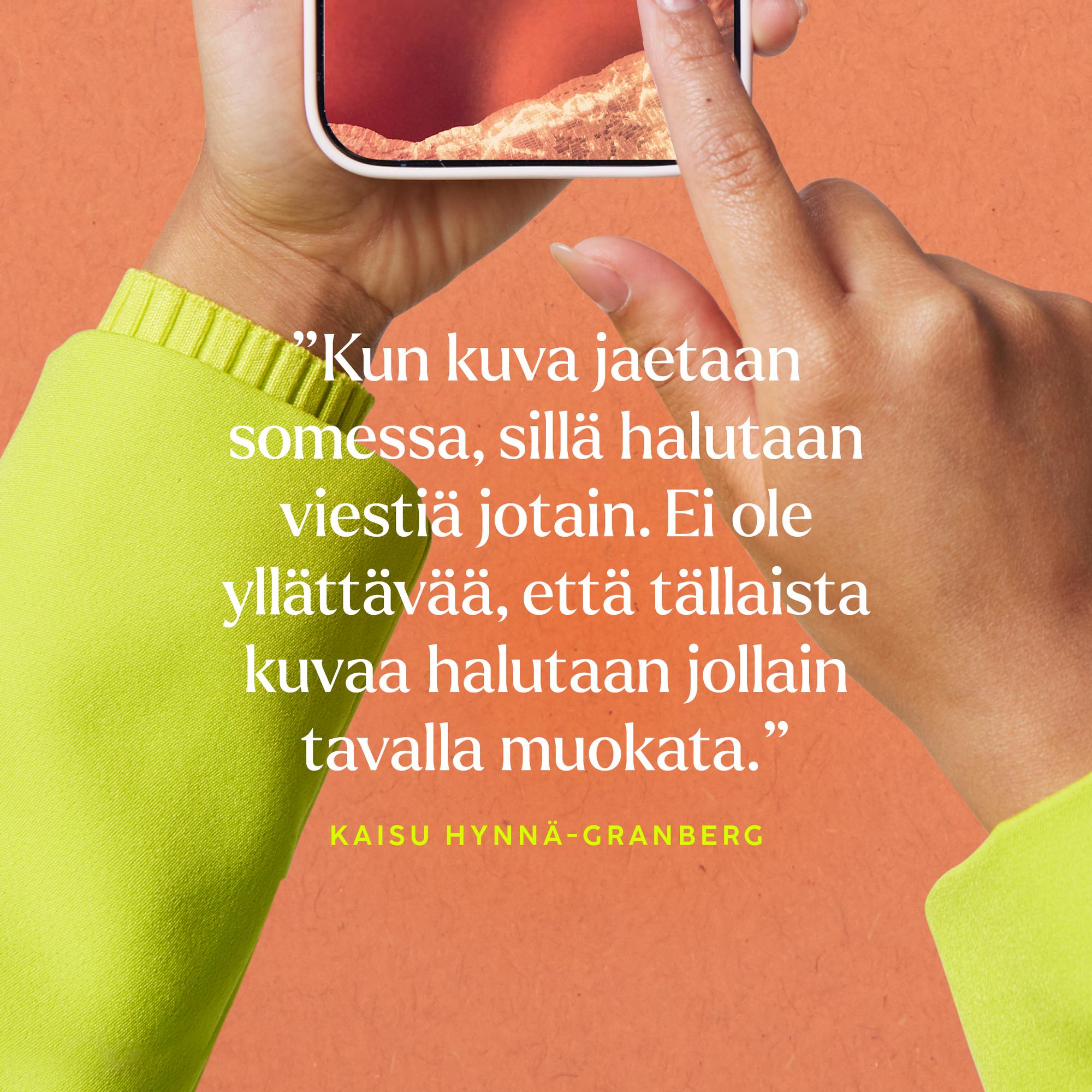 ”Somesovellusten teknisten ominaisuuksien takia kuvan muokkaaminen voi tuntua olennaiselta osalta mediatuotantoa”, Hynnä-Granberg pohtii.