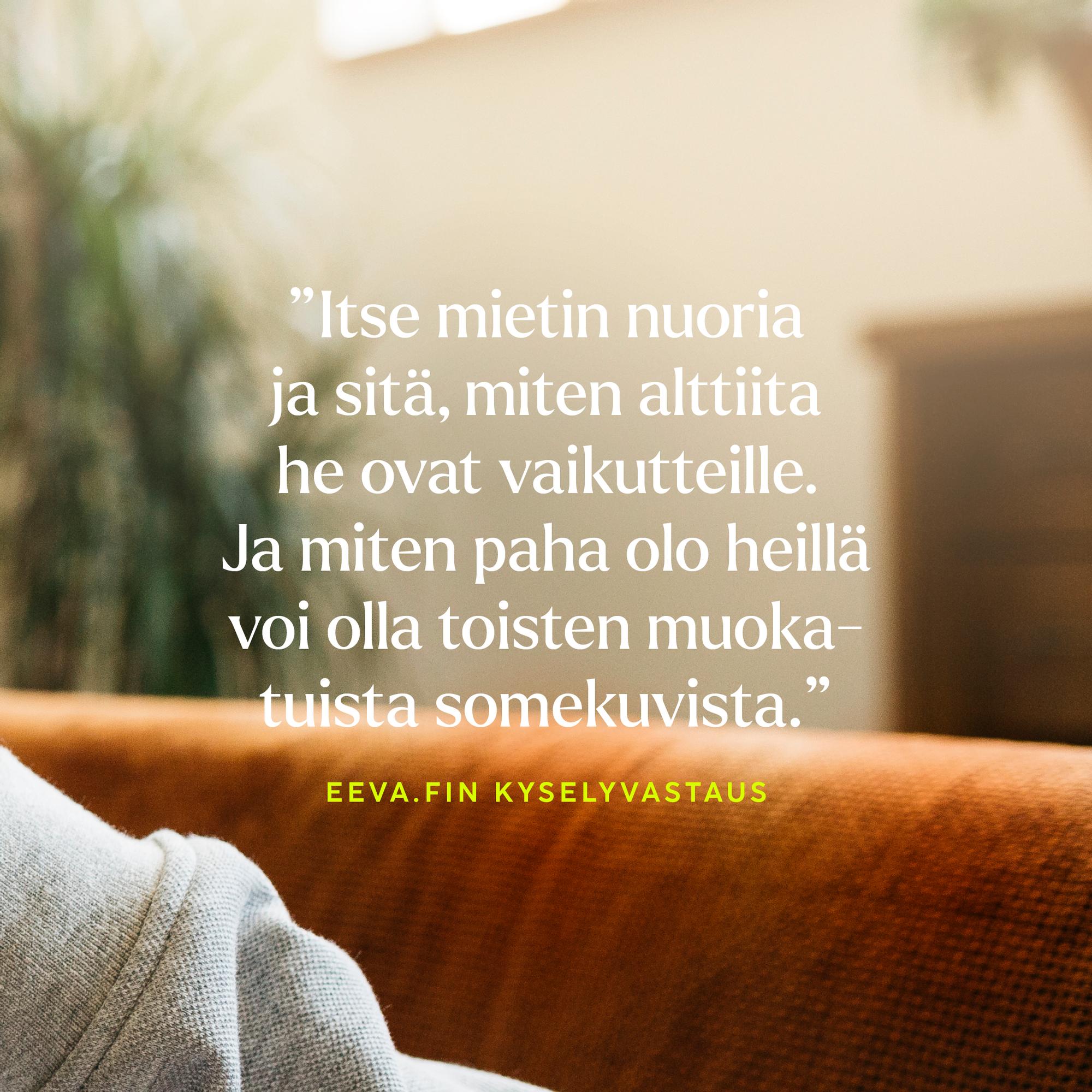 ”Itse mietin nuoria ja sitä, miten alttiita he ovat vaikutteille. Ja miten paha olo heillä voi olla toisten muokatuista somekuvista. Joskus minulla on paha mieli haavoittuvaisten nuorten puolesta.”