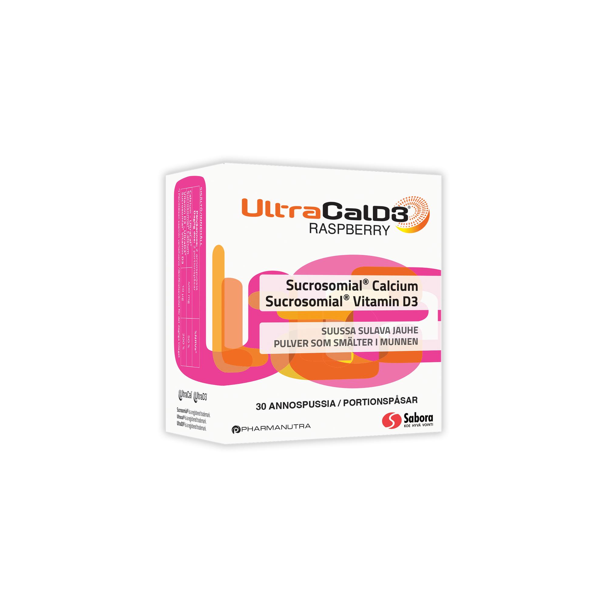 Sukrosomiaalinen rakenne suojaa kalsiumia ja D-vitamiinia mahalaukun happamuudelta ja mahdollistaa niiden tehokkaan imeytymisen koko ohutsuolen alueelta. Jauhe voidaan nauttia itselle sopivalla hetkellä ilman ruokailuun liittyviä rajoituksia. UltraCalD3 sopii myös raskauden ja imetyksen aikana käytettäväksi ja on saatavilla apteekeista miellyttävän vadelman ja herkullisen keksin makuisena.