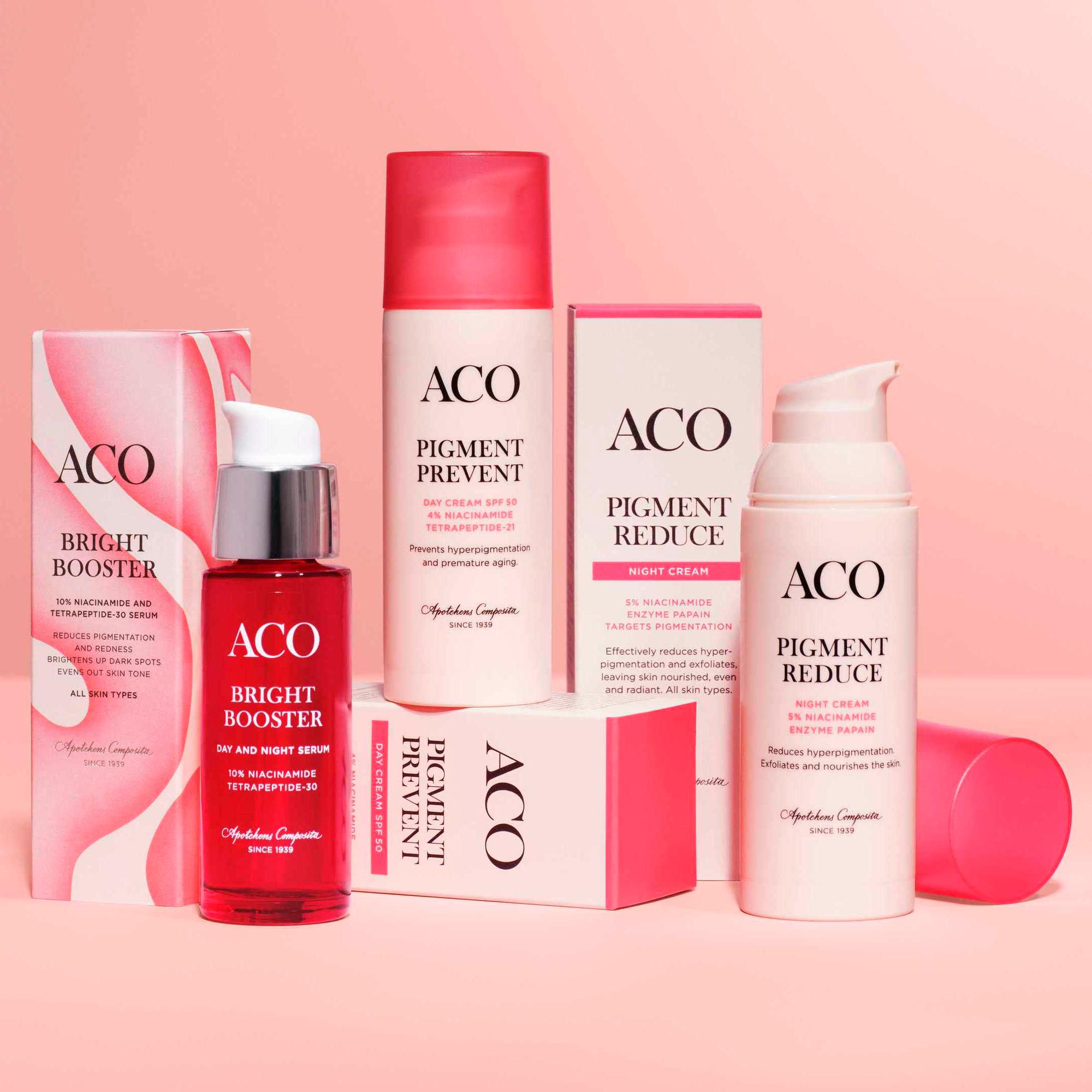 - ACO Bright Booster -seerumi on tiivistetty tehoseerumi, joka kirkastaa pigmenttiläiskiä ja tasoittaa ihon sävyä. Tämä monitehoinen seerumi sisältää 10 % niasiiniamidia, joka kirkastaa ja tasoittaa ihon sävyä, vähentää punoitusta ja vahvistaa ihon suojakerrosta. Tetrapeptidi-30 vähentää tehokkaasti pigmentaatiota, ja 2 % PHA kuorii hellävaraisesti tehden ihosta kirkkaan ja heleän. Seerumia käytetään aamuin illoin ennen päivä- ja yövoiteen levittämistä.