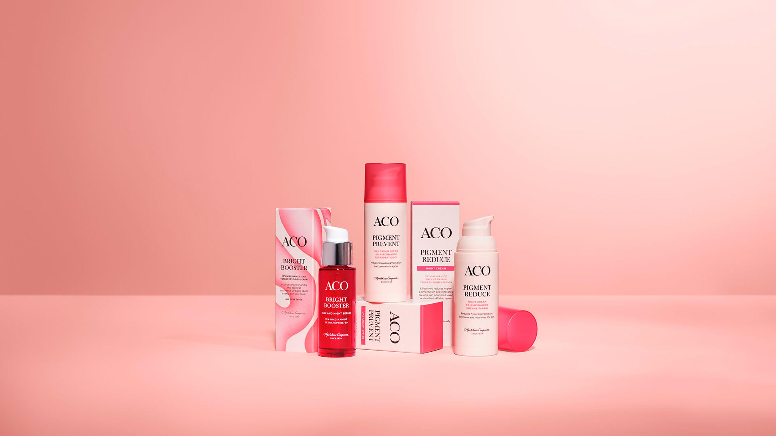 Ihon suojaaminen auringolta ja huolellinen ihonhoito oikeanlaisilla tuotteilla ja ainesosilla ehkäisevät tehokkaasti pigmenttimuutosten muodostumista. ACO Pigment -tuotesarja on suunniteltu ehkäisemään ja vaalentamaan pigmenttimuutoksia. Tuotteiden vaikutus perustuu pigmentaatiota hillitseviin tehoaineisiin, kuten C-vitamiiniin, niasiiniamidiin, papaiinientsyymiin ja tetrapeptideihin. Ne vähentävät pigmentin muodostumista ja tasoittavat ihon sävyä.
