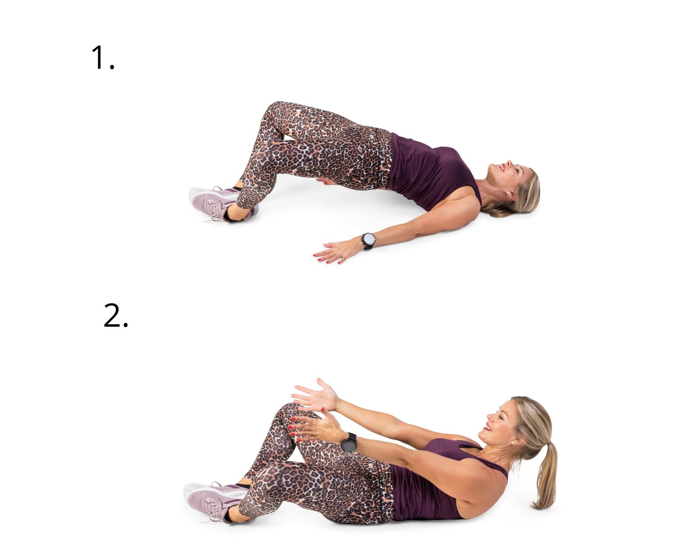 1. Asetu selinmakuulle. Avaa jalat ja aseta jalkapohjat yhteen. Näin liike kohdistuu vatsalihaksiin.