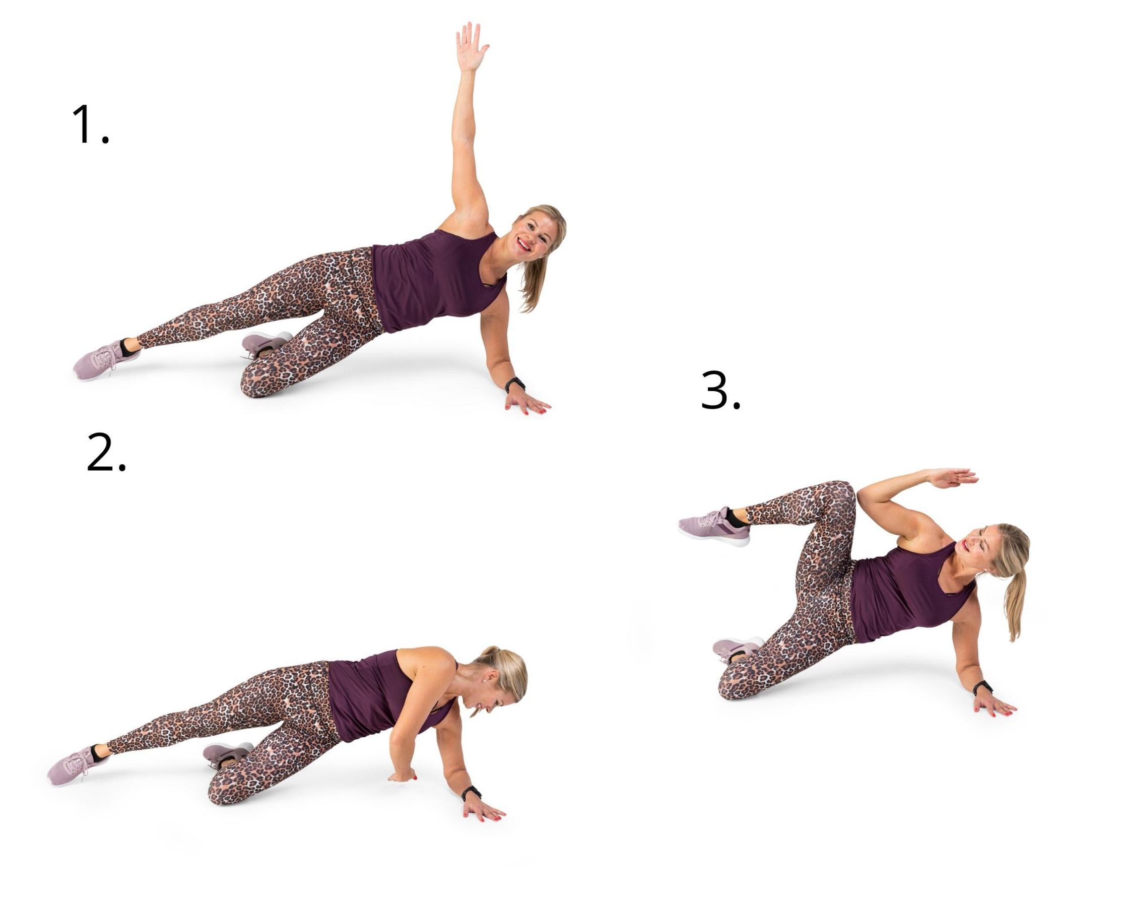 1. Asetu kylkilankkuun kyynärpään varassa ja alempi jalka koukussa. Nosta lantio ja käsi kohti kattoa.
