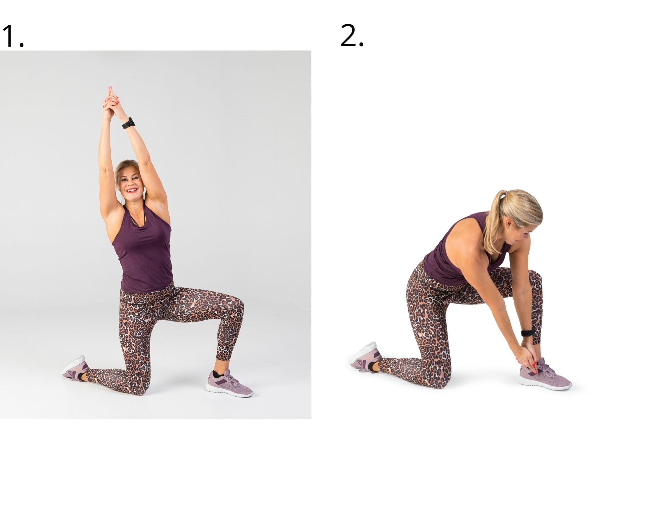 1. Käy polviseisontaan vasen jalka edessä, oikea takana.Tuo kädet yhteen ja ojenna ne suorina ylös oikeaan yläviistoon.