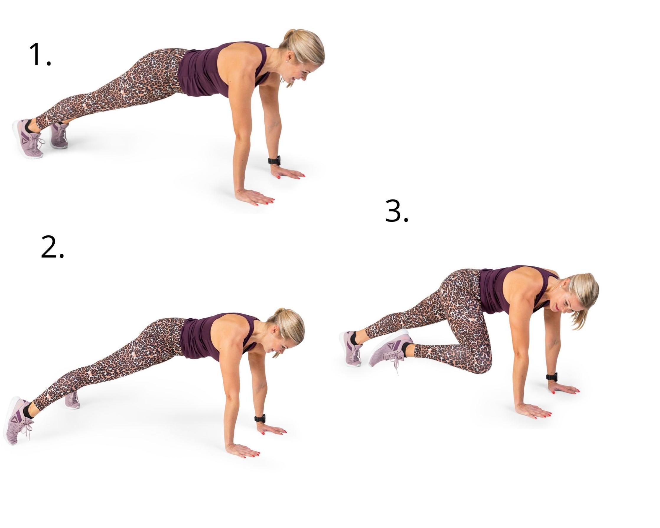 Toista jokaista liikettä ohjeessa kerrottu määrä ja siirry sen jälkeen seuraavaan liikkeeseen. Tee yhteensä 3 kierrosta.
